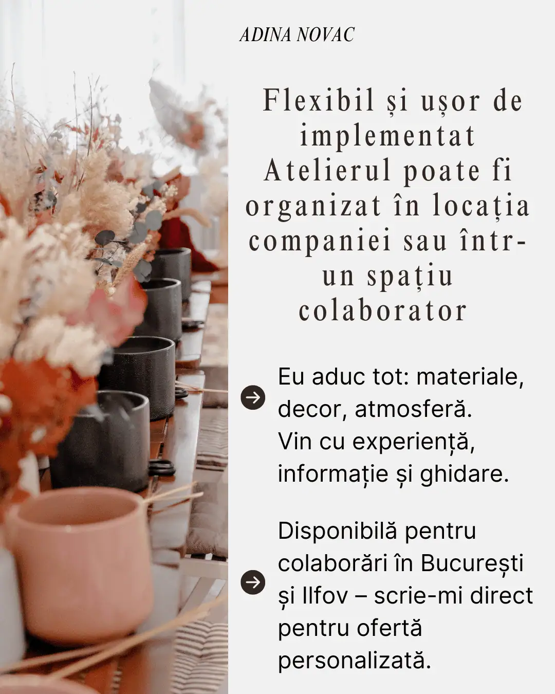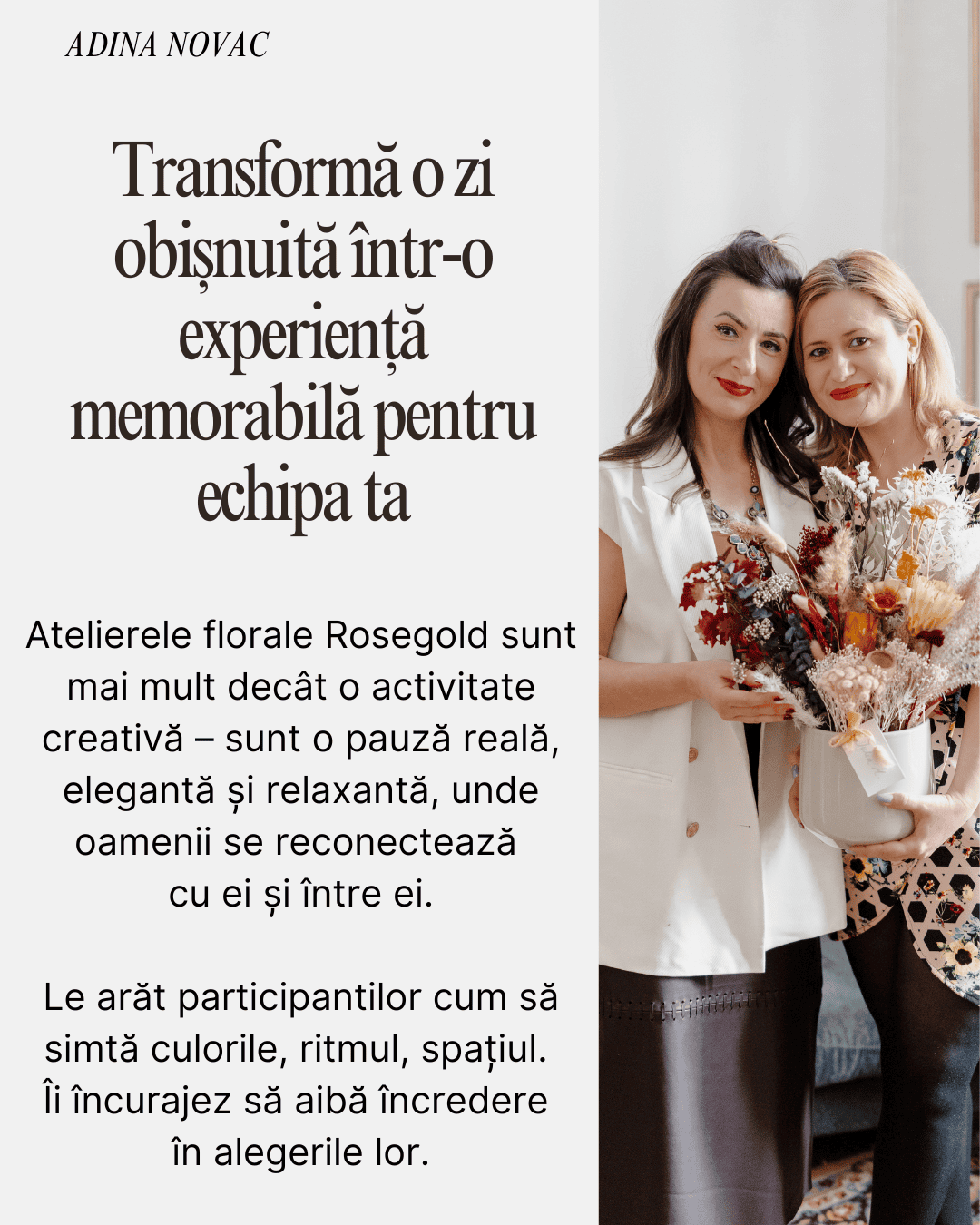 Eu sunt Adina, fondatoarea RoseGold Events, iar workshopurile mele cu flori stabilizate, criogenate și uscate sunt despre reconectare,